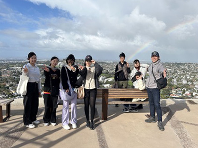 現地サポート主催のMt Edenへの遠足。山頂から虹をバックに記念撮影。